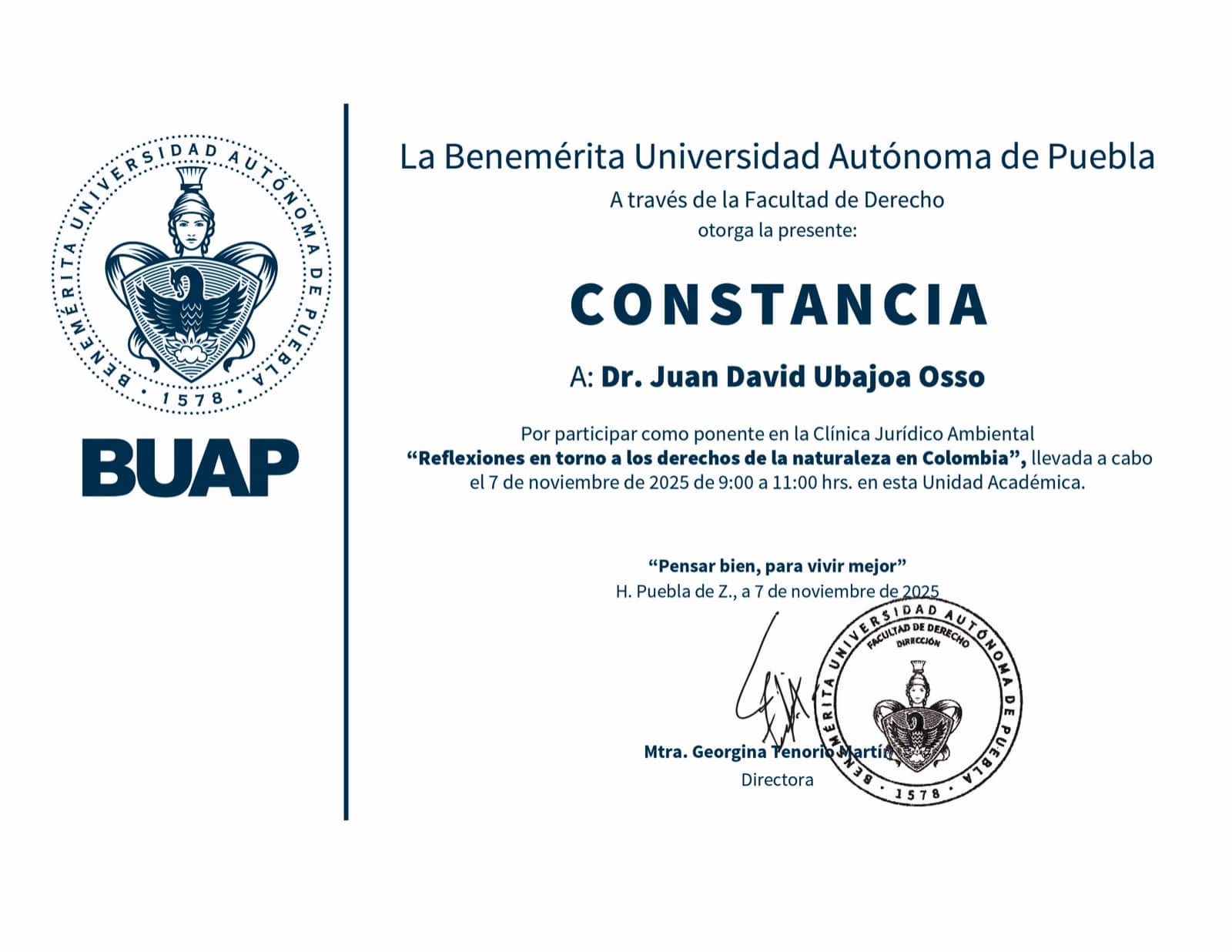 Dicha sesión se llevó a cabo de manera telemática el 7 de noviembre de 2025 y contó con la presencia de varios miembros de la clínica citada, que es un espacio académico que reúne tanto a docentes-investigadores como a estudiantes de la Benemérita Universidad Autónoma de Puebla para analizar temas jurídico-ambientales actuales y relevantes. En su conferencia, el Dr. Juan David Ubajoa Osso ha intentado sentar algunas ideas respecto al futuro de los derechos de la naturaleza, ideas basadas en el propósito de que tales derechos se traduzcan en efectos positivos y reales en el ámbito de la protección jurídica de la naturaleza y de los elementos de esta.