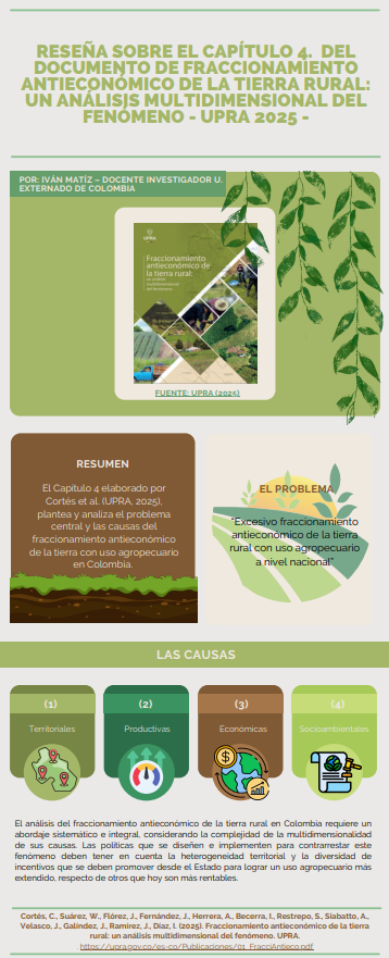 El Capítulo 4 del documento elaborado por Cortés et al. (UPRA, 2025), plantea y analiza el problema y las causas del fraccionamiento antieconómico de la tierra en Colombia, enfatizando en el uso agropecuario. El Capítulo explica este fenómeno desde múltiples causas: históricas, territoriales, productivas, económicas y socioambientales, sin perjuicio de otras unidades de análisis. Como fenómeno, se califica de excesivo, con potencial de comprometer la sostenibilidad del desarrollo rural en Colombia.